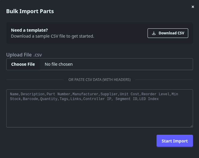 Importing inventory in bulk is seamless using the bulk import. This tool allows you to quickly bulk import parts, skipping the UI when you have many parts to add at once.
